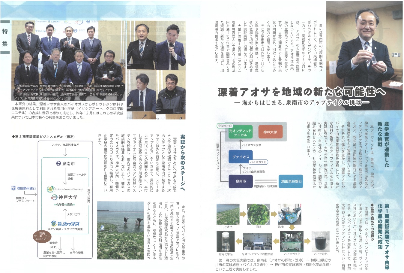 泉南市の観光スポットであるタルイサザンビーチで大量に漂着するアオサを活用して製品に変えることを目標に、「海からはじまる、泉南市のアップサイクル挑戦」と題してはじまった「産学金官連携」のプロジェクト。